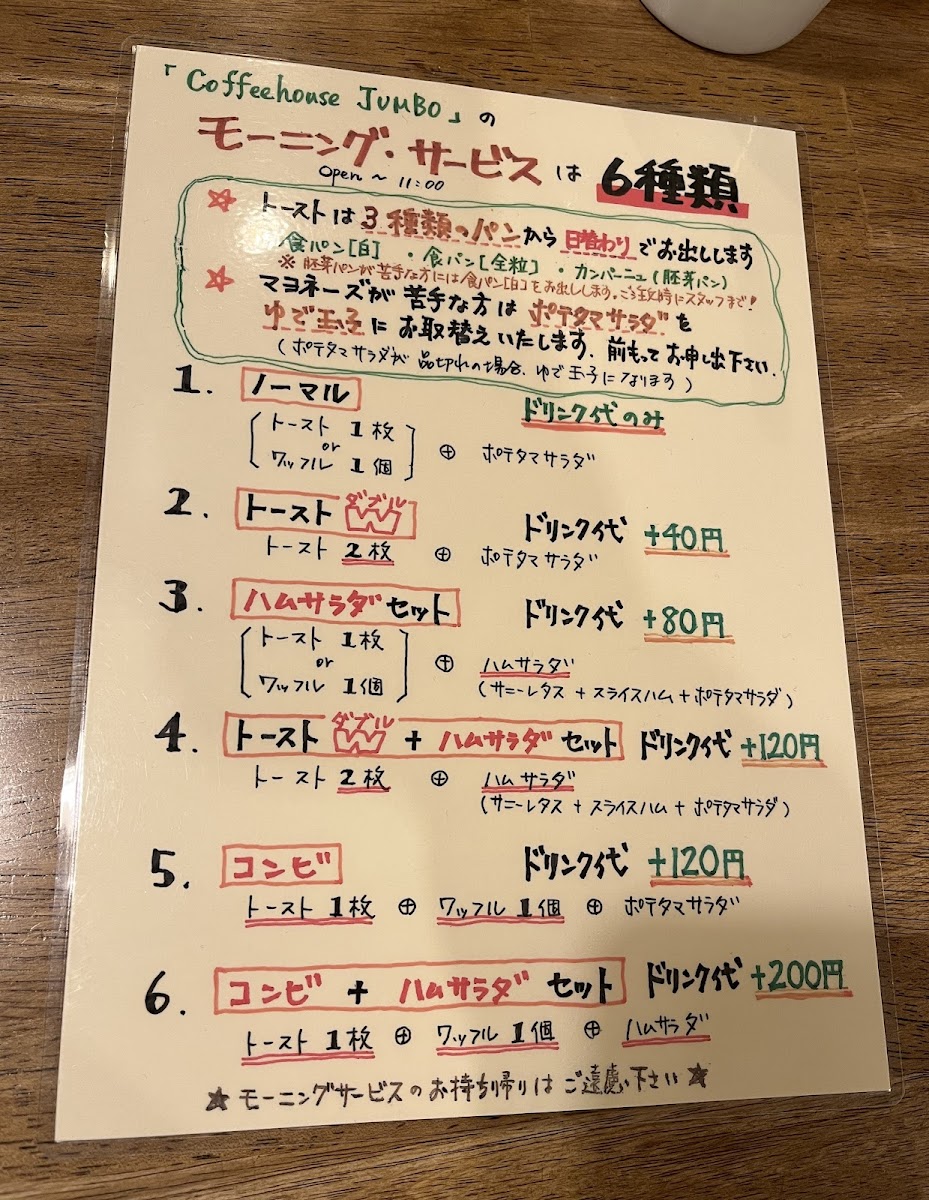 The atmosphere at Jumbo is serene, inviting guests to unwind with a calming cup of coffee and a sweet treat. Many reviews highlight the polite, albeit reserved, service and the meticulously prepared menu, which encourages diners to savor their experience rather than rush. Whether you're indulging in a warm cinnamon sugar toast or relishing a quiet morning, Jumbo offers a tranquil retreat from the bustling city life. Don't forget to check the diverse drink menu, which is conveniently tucked away under the table!